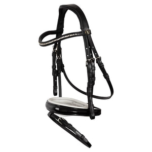 This bridle stands out because of the shiny imitation diamonds from Stellux™ that are firmly anchored in the slightly curved browband to ensure that they cannot simply fall out. In addition, the flash noseband with patent leather provides extra shine. The noseband is equipped with a flash strap with protective flap at the buckle.