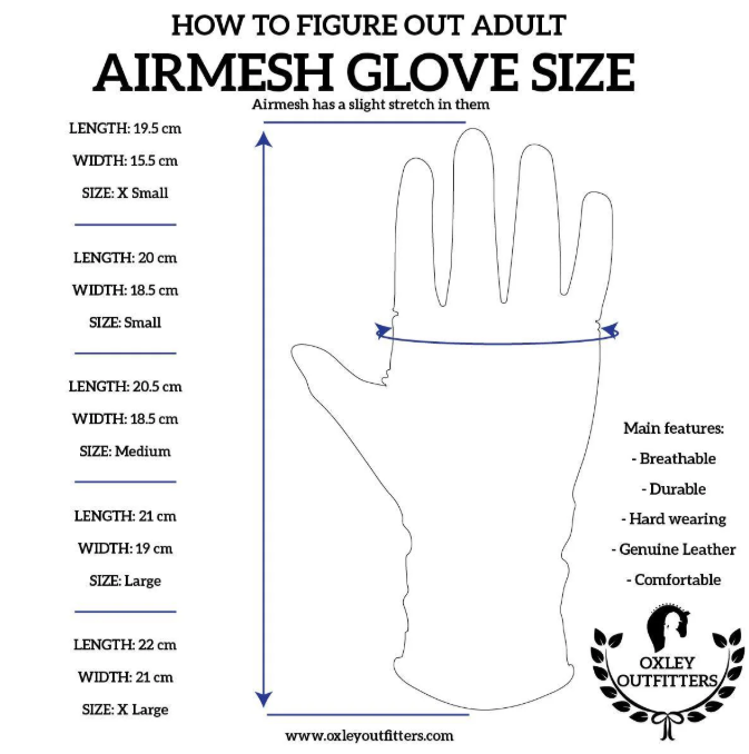 Oxley Outfitter Airmesh Gloves - Designed for functionality, ventilation and appearance. Perfect for hot days riding - The durable hand selected mesh fabric supplies ventilation to the upper hand, partnered with a durable leather palm. The soft leather palm brings grip to the glove incorporated with ventilation holes, creates the perfect competition glove. The two fabrics combines with a velcro wrist is a match made in heaven.