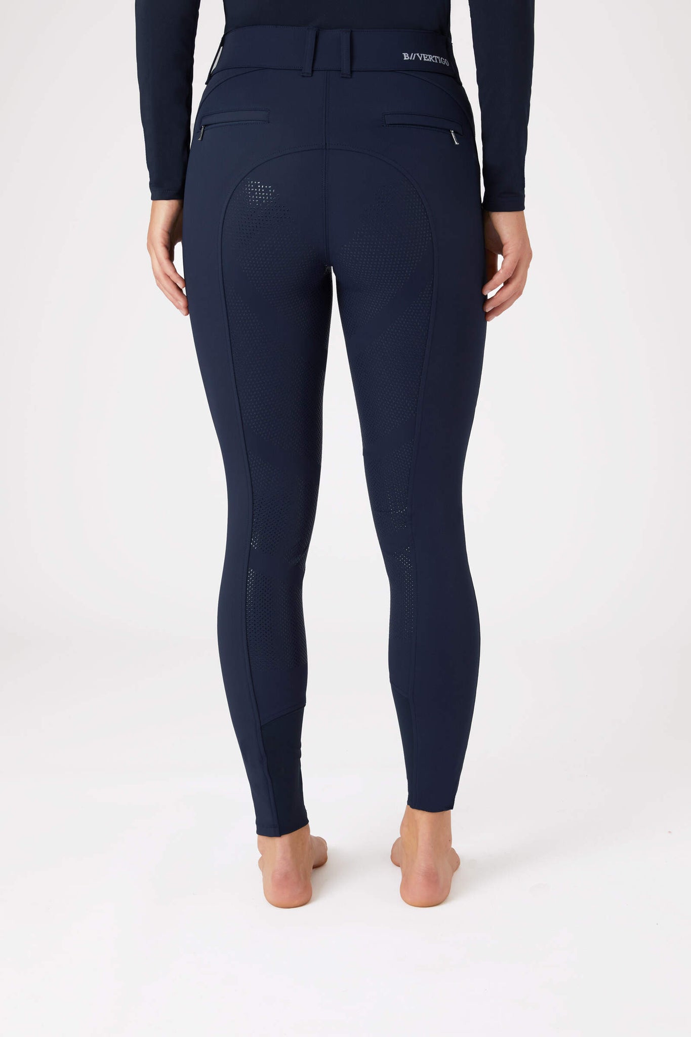 Our B Vertigo Davina breeches are made from technical, breathable material. They are highly elastic, but keep their shape. Two big thigh pockets are practical for keeping your phone in reach, and two small back pockets with zippers keep small belongings safe. The silicone full seat keeps you safely in the saddle. Combine these breeches with our B Vertigo Davina training shirt for a full outfit!