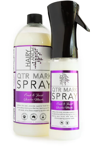 Dampen your horse’s coat with a spritz of water or Essential Oil Coat Conditioner. Draw your quarter mark patterns, then spray with a fine mist of QTR Mark Spray to set your patterns & add shine.