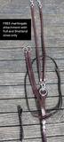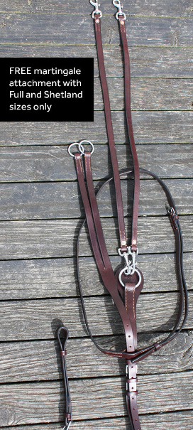 Includes neck strap/girth attachment and running rein clip set. Free martingale attachment only comes with Full and Shetland sizes only.