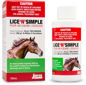 Lice N' Simple pour-on Equine Lousicide is an easy-to-apply, safe, and effective treatment for the control of biting lice on horses. It controls biting lice on horses by preventing the development of immature lice in the coat and those which hatch from eggs. Lice N' Simple is an insect growth regulator not a knock-down insecticide. It produces a rapid decline in lice numbers with trials showing greater than 75% drop in lice numbers by 3 weeks and greater than 99% drop in lice by 7 weeks, with no detectable lice by 10 weeks after treatment.