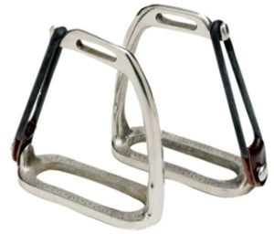 Stainless steel peacock safety irons featuring a rubber band and english leather strap to release the foot in the event of a fall