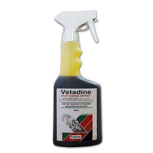 Vetadine PVP wound spray is an aid in the treatment or prevention of local infestations in cases of wounds, abcesses, burns and fungal infections. Vetadine PVP wound spray can be used to disinfect umbilical stumps, & also cut teats & udder wounds in cattle. A bactericidal, sporicidal and vermicidal properties. Vetadine PVP wound spray contains povidone-iodine 43.5mg per ml.